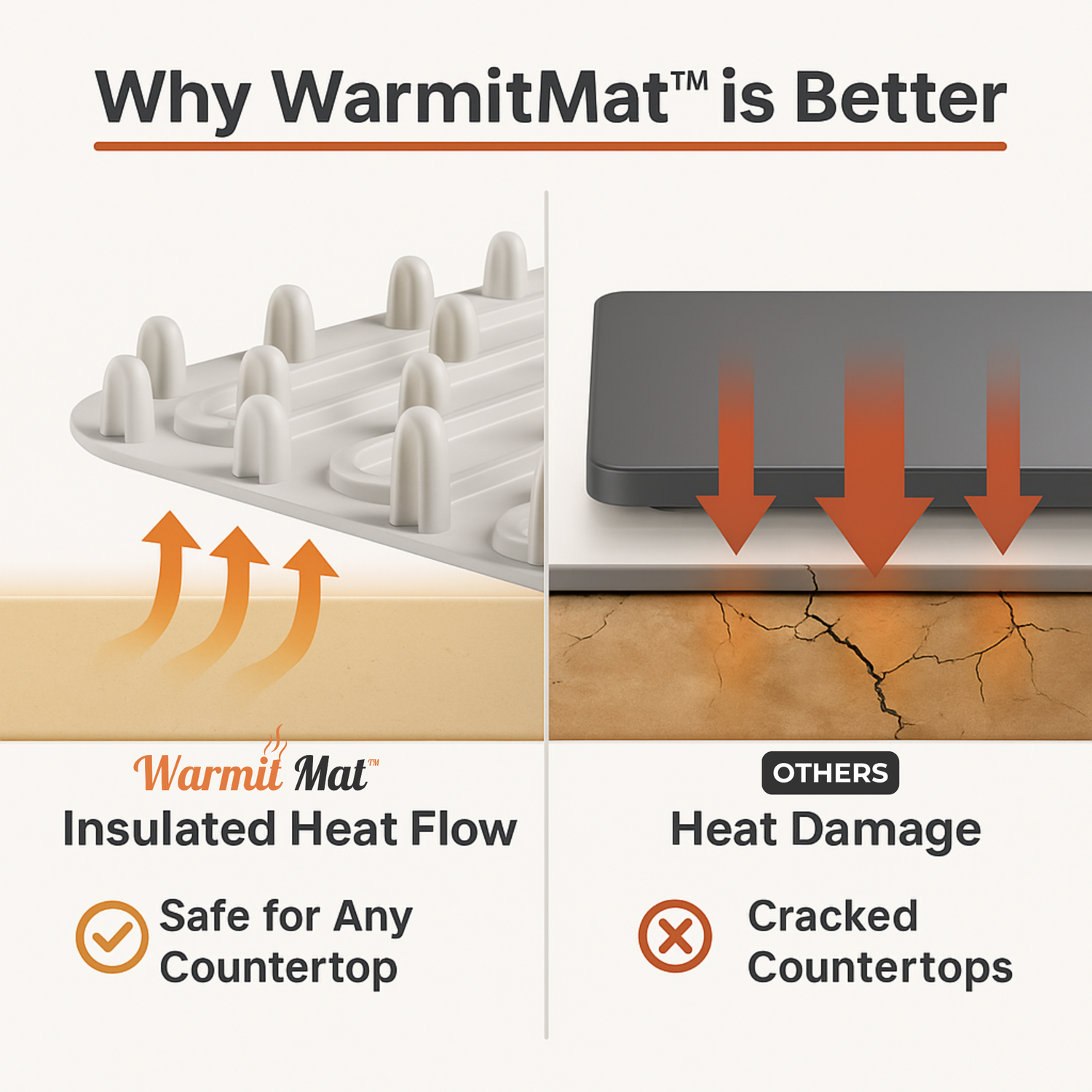 With heat-resistant silicone tips, the WarmitMat™ protects your surfaces from heat damage. Use it on wood, marble, or any surface worry-free, no burns, cracks, or marks.
